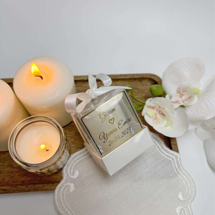 Şeffaf Kutulu Cam Bardak Mum Hediyelik + Varak Etiketli (5x5x7)